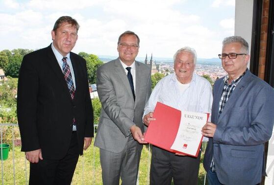 Zu einem ganz besonderen Ehrungstermin trafen sich heute die Bamberger SPD-Mandatsträger im Berggebiet. MdB Andreas Schwarz, OB Andreas Starke und SPD-Kreisvorsitzender Felix Holland überreichten die goldene Partei-Ehrennadel für 70 Jahre Parteizugehörigkeit an Paul Limberg, der sich mit seinen 91 Jahren bester Gesundheit erfreut und die kleine Parteidelegation persönlich empfing.